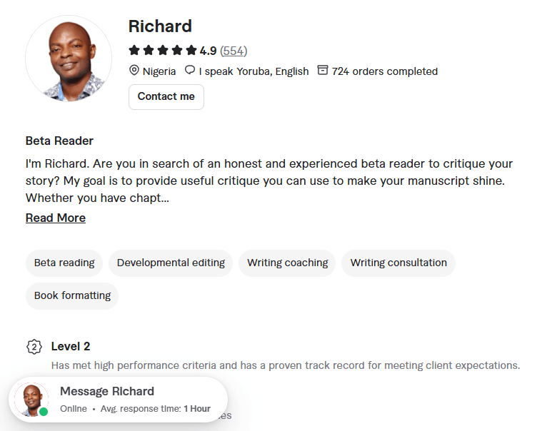 Richard is a professional beta reader on Fiverr who specializes in providing detailed and honest feedback for novels, short stories, and other fiction works. With years of experience reviewing manuscripts across various genres, Richard has helped writers refine their stories, improve pacing, strengthen characters, and polish dialogue. As a Level 2 Seller, he is known for his thoughtful and actionable critiques, aiming to guide writers toward creating compelling and market-ready stories.