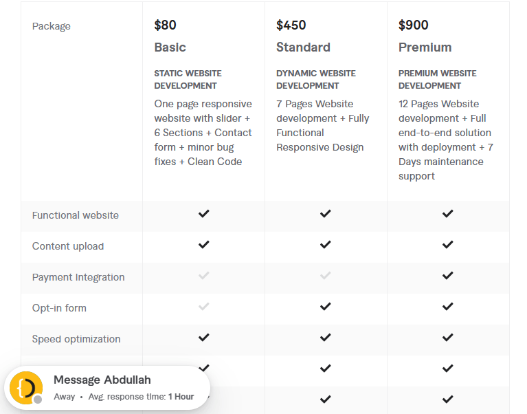 - Standard Package – $1,200: 3-page design with 5 features, including user authentication and database integration.