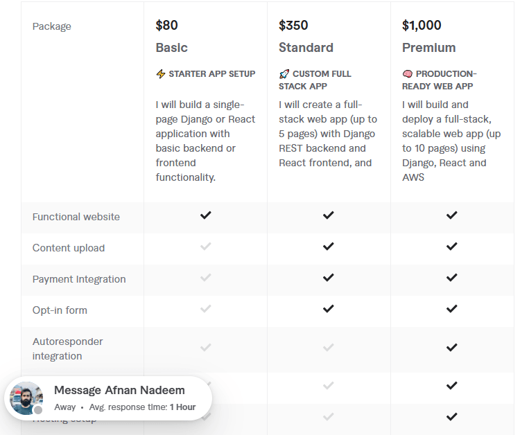 Afnan’s Fiverr gig, “I will develop and deploy websites in Django React AWS,” offers complete full-stack web development and deployment services. His service covers everything from backend API development to frontend UI and cloud hosting setup.