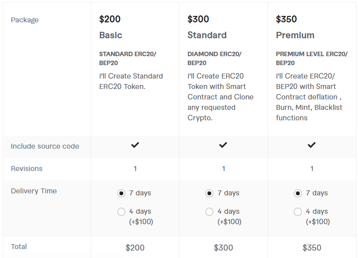 - Basic Package – $200: Develop a standard ERC20 cryptocurrency token.