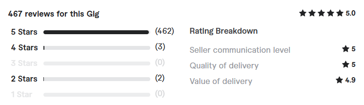 - Client satisfaction: Highly rated with 460+ positive feedback on Fiverr