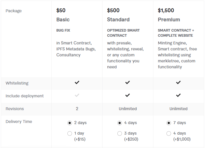 - Premium Package – $1,500: Minting engine, smart contract development, free whitelisting using Merkle tree, and custom functionality.