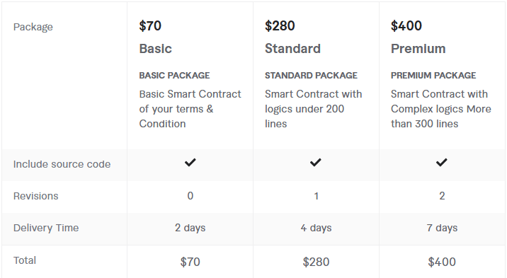 - Standard Package – $280: Smart contract with logic implemented in under 200 lines.